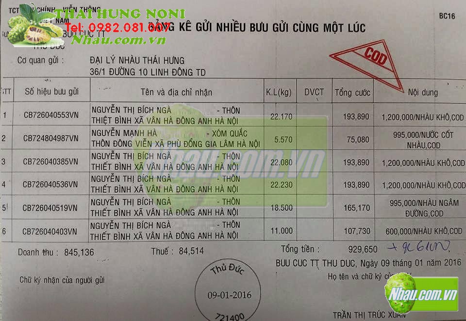 Ngày 09/01/2016: Khách hàng: MAI NGỌC PHÁCH