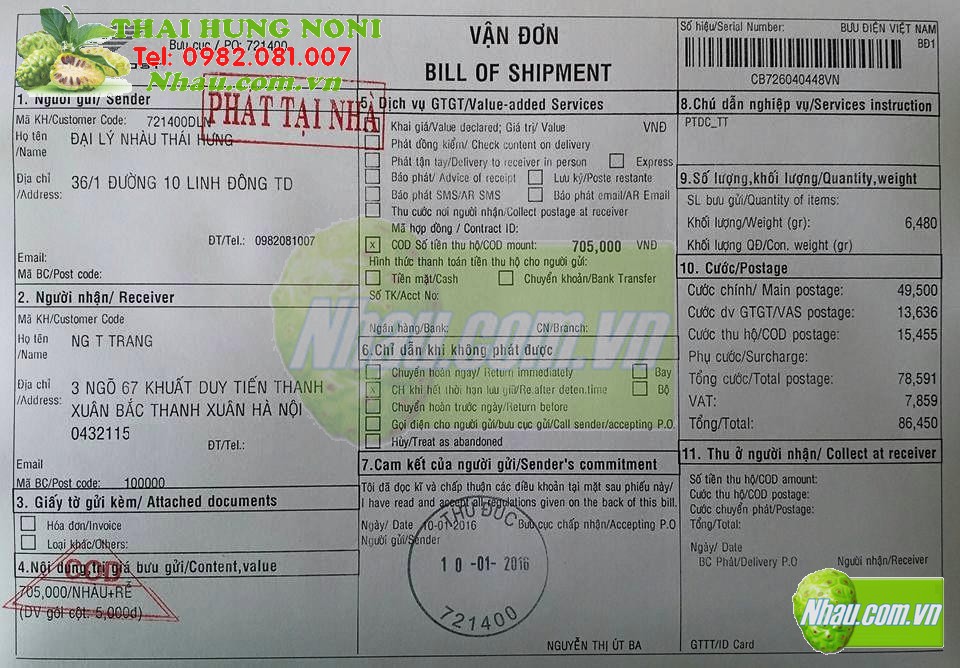 Ngày 19/01/2016: Khách hàng: BÙI HÀ PHONG