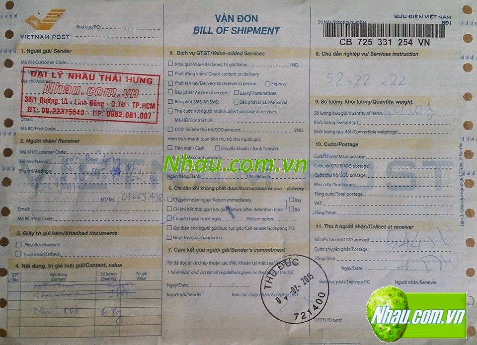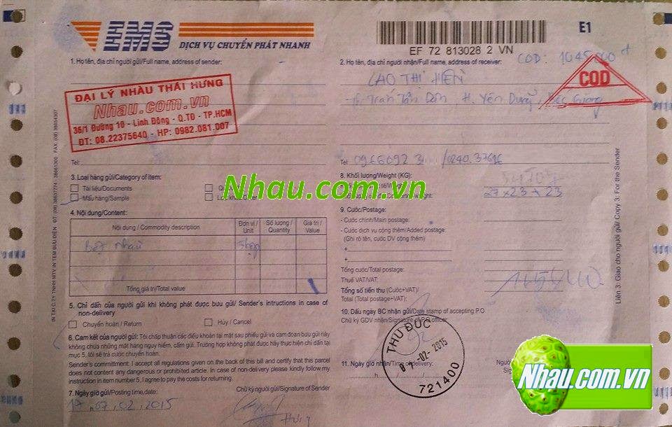 - Ngày 07/02/2015: Khách hàng: CAO THỊ HIỀN