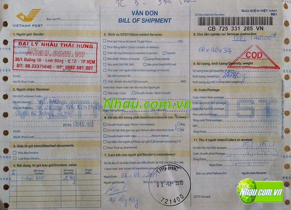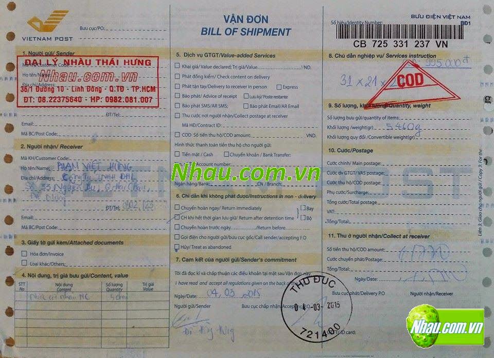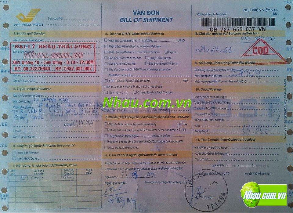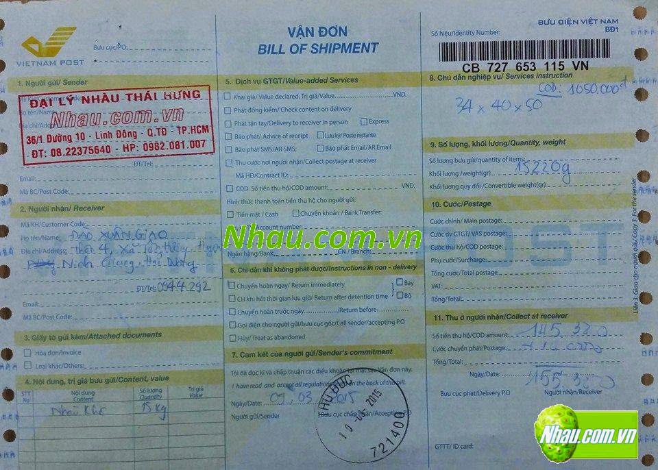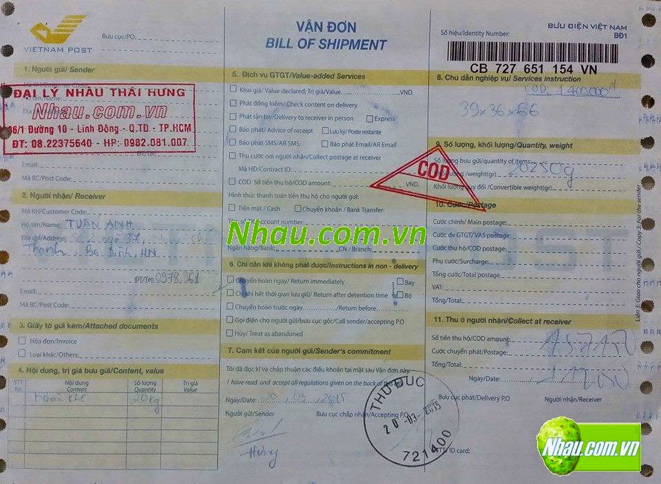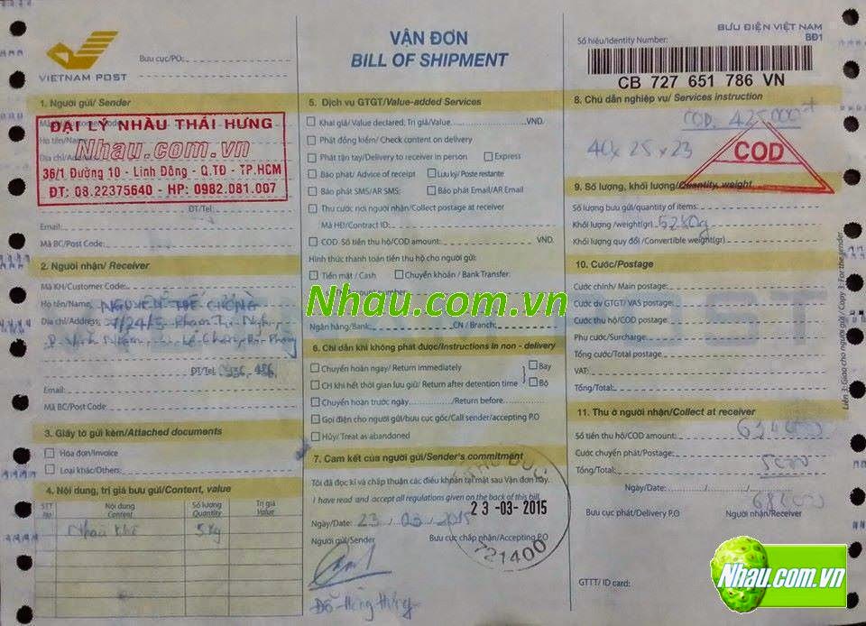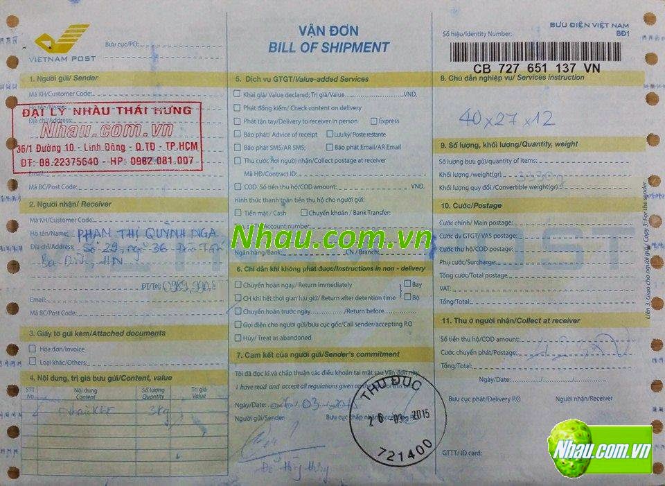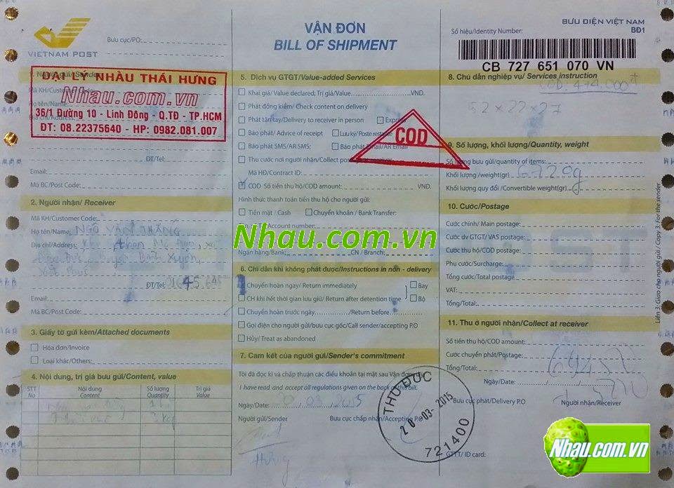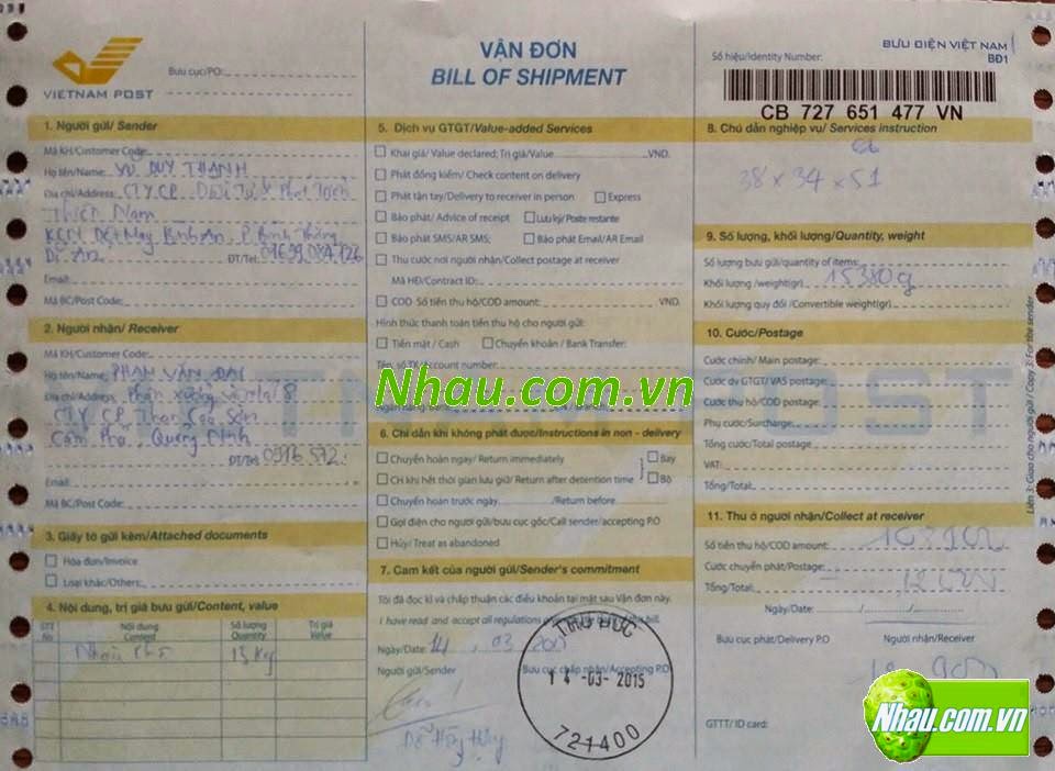 - Ngày 20/03/2015: Khách hàng: NGÔ VĂN THẮNG