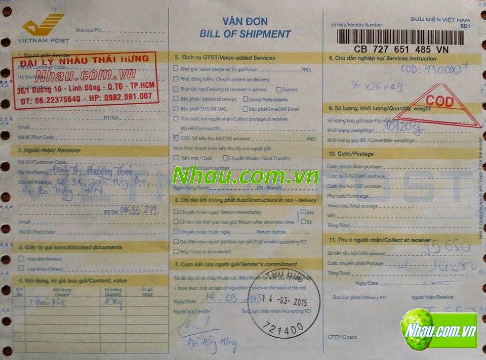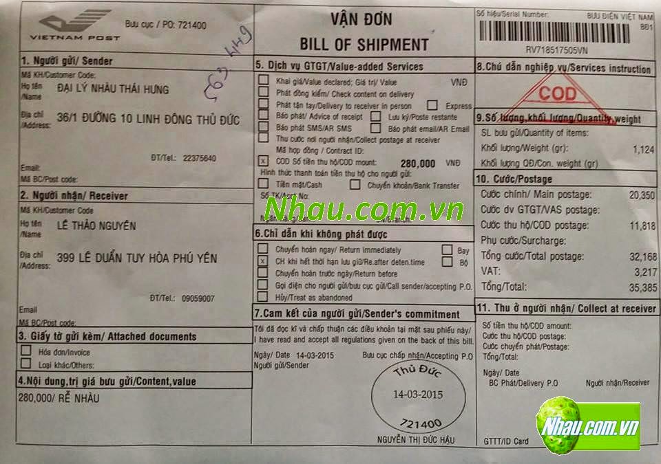 - Ngày 14/03/2015: Khách hàng: ĐINH THỊ PHƯƠNG THẢO