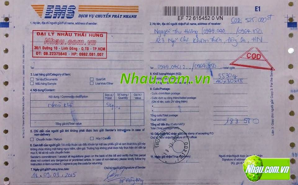 - Ngày 09/03/2015: Khách hàng: NGUYỄN THU HƯƠNG