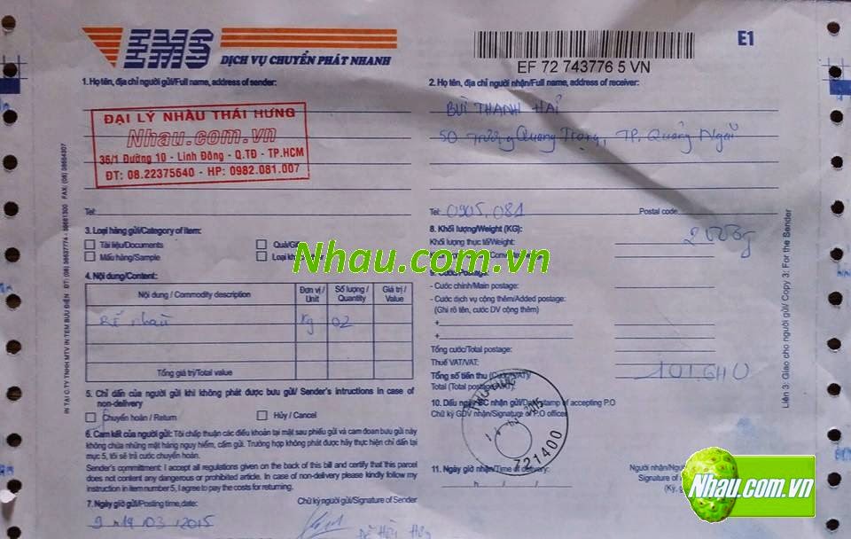 - Ngày 14/03/2015: Khách hàng: BÙI THANH HẢI
