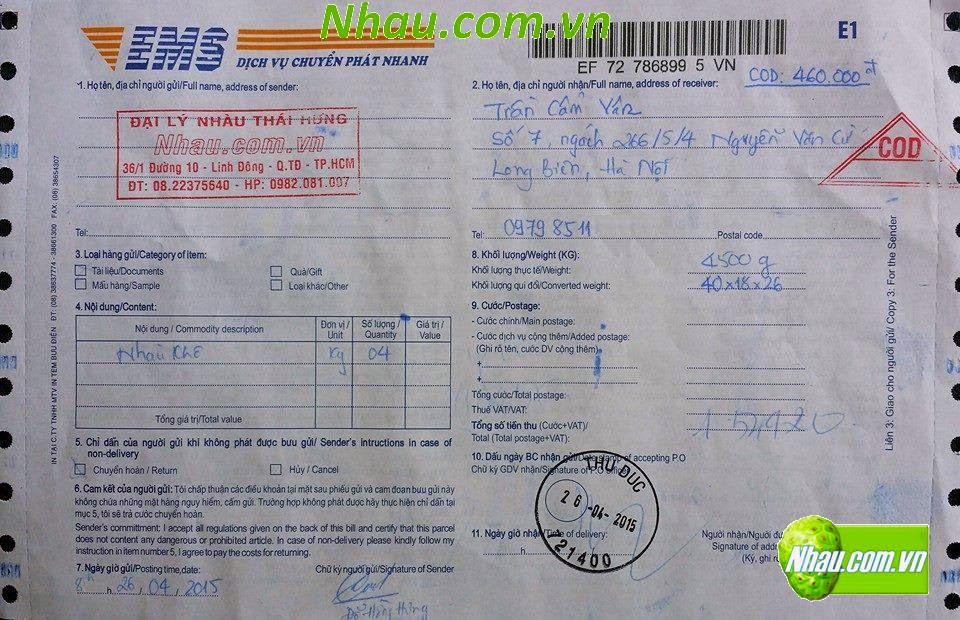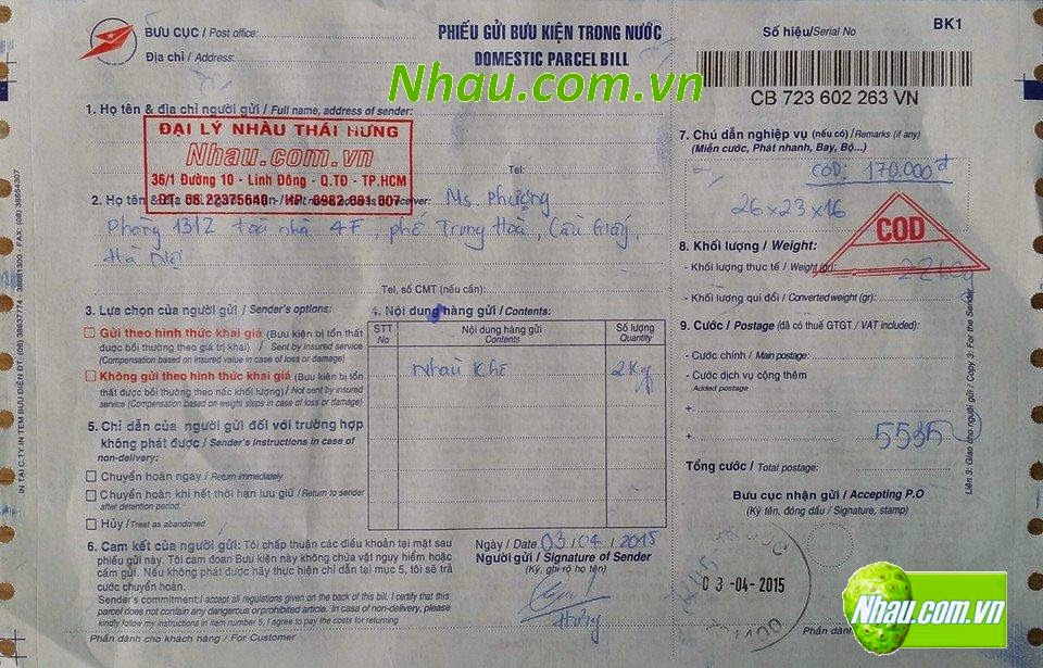 - Ngày 08/04/2015: Khách hàng: NGUYỄN TIẾN VIỆT