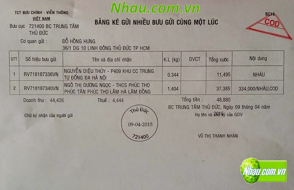 - Ngày 09/04/2015: Khách hàng: NGÔ THỊ DƯƠNG NGỌC