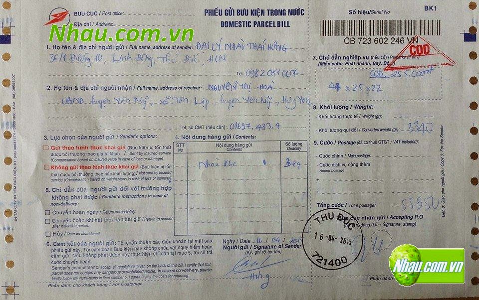 - Ngày 09/04/2015: Khách hàng: NGUYỄN THỊ THU HIỀN