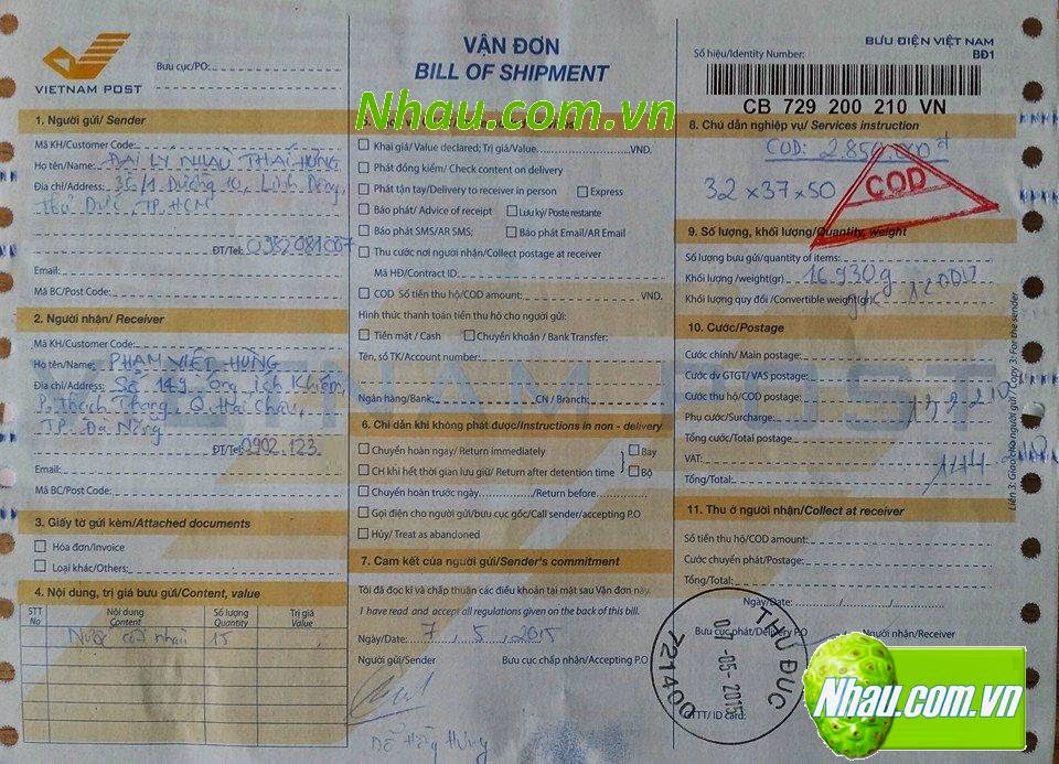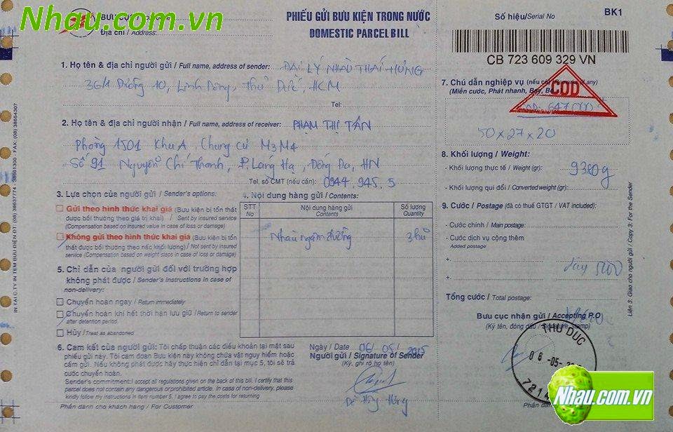 Ngày 21/05/2015: Khách hàng: CÔNG THU