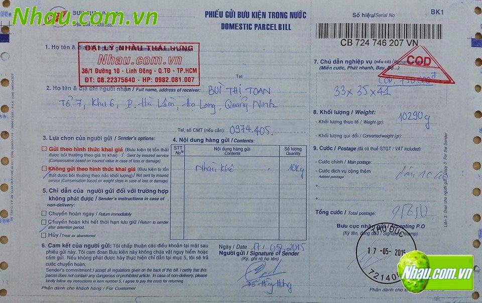 Ngày 17/05/2015: Khách hàng: BÙI THỊ TOAN
