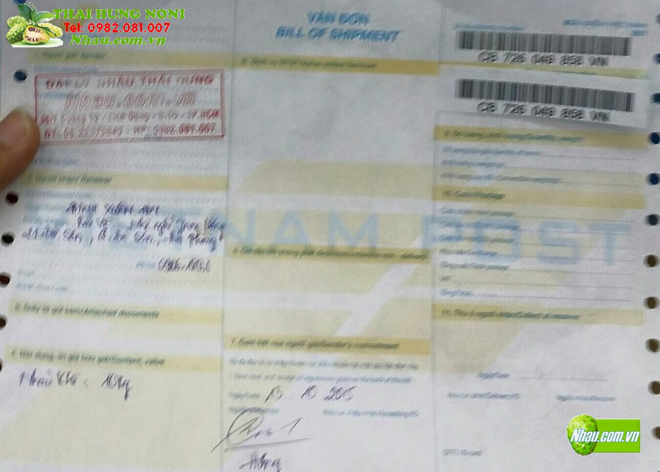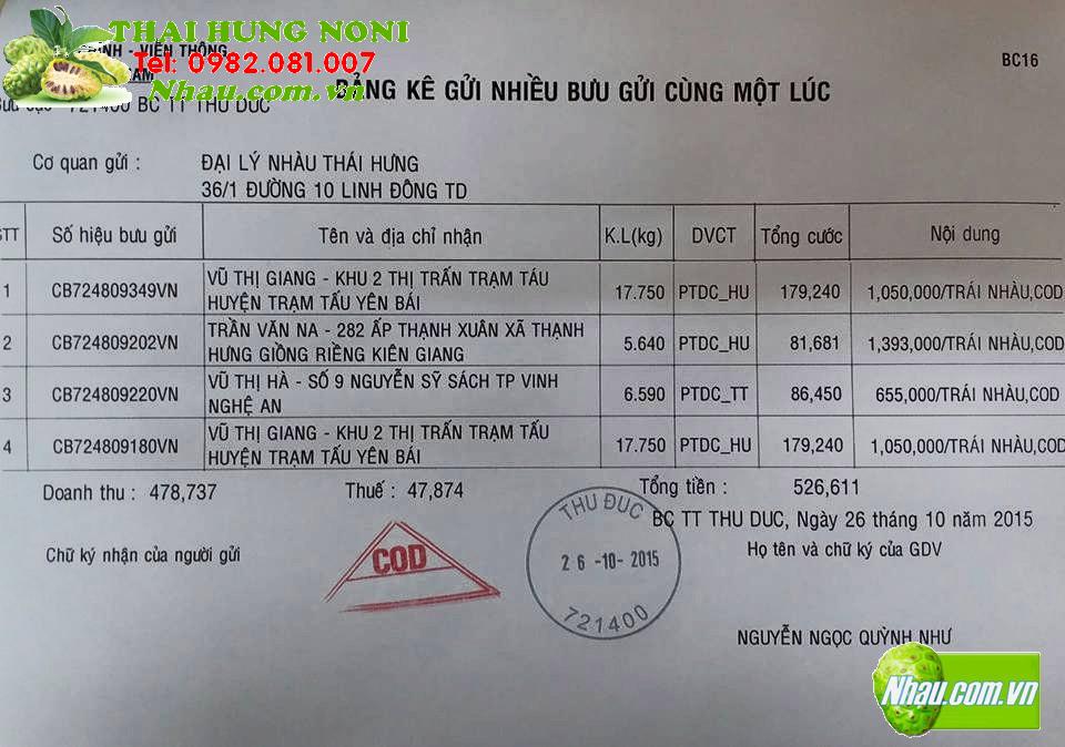 Ngày 19/10/2015: Khách hàng: NGUYỄN THỊ THU HƯƠNG
