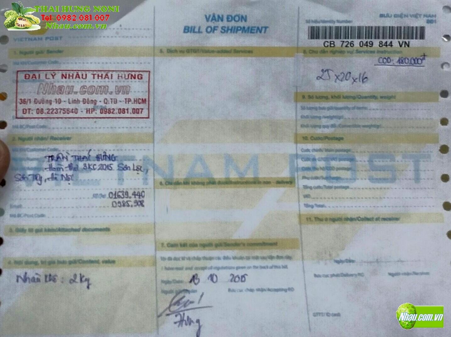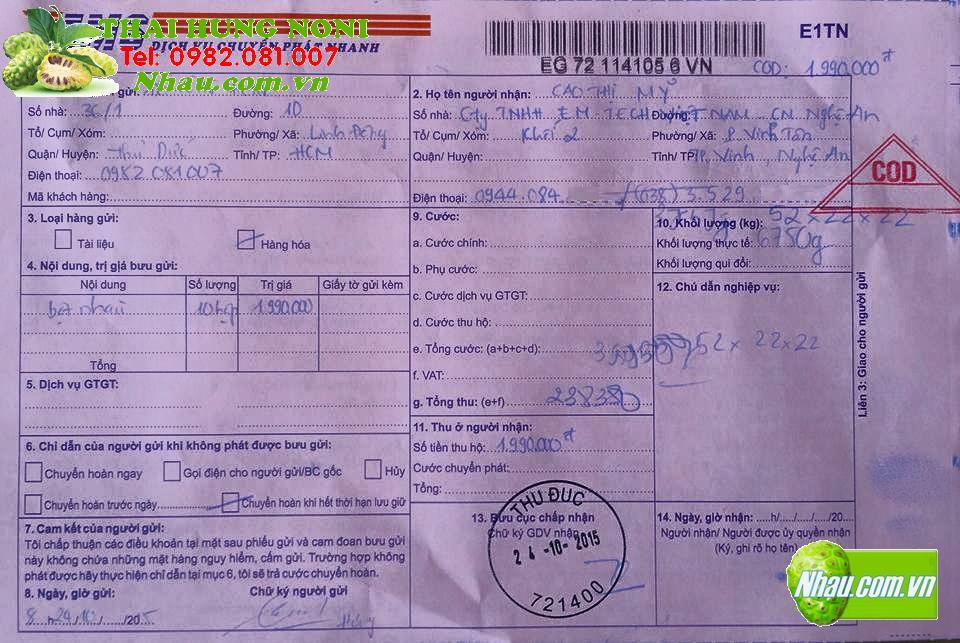 Ngày 19/10/2015: Khách hàng: NGUYỄN THỊ THƯƠNG