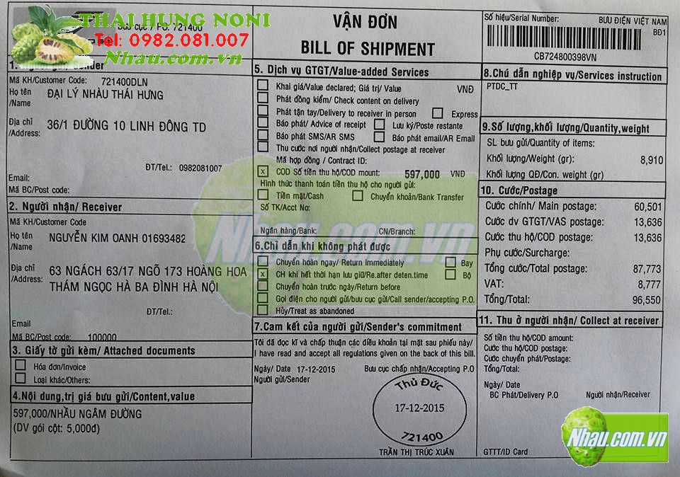 Ngày 17/12/2015: Khách hàng: NGUYỄN KIM OANH