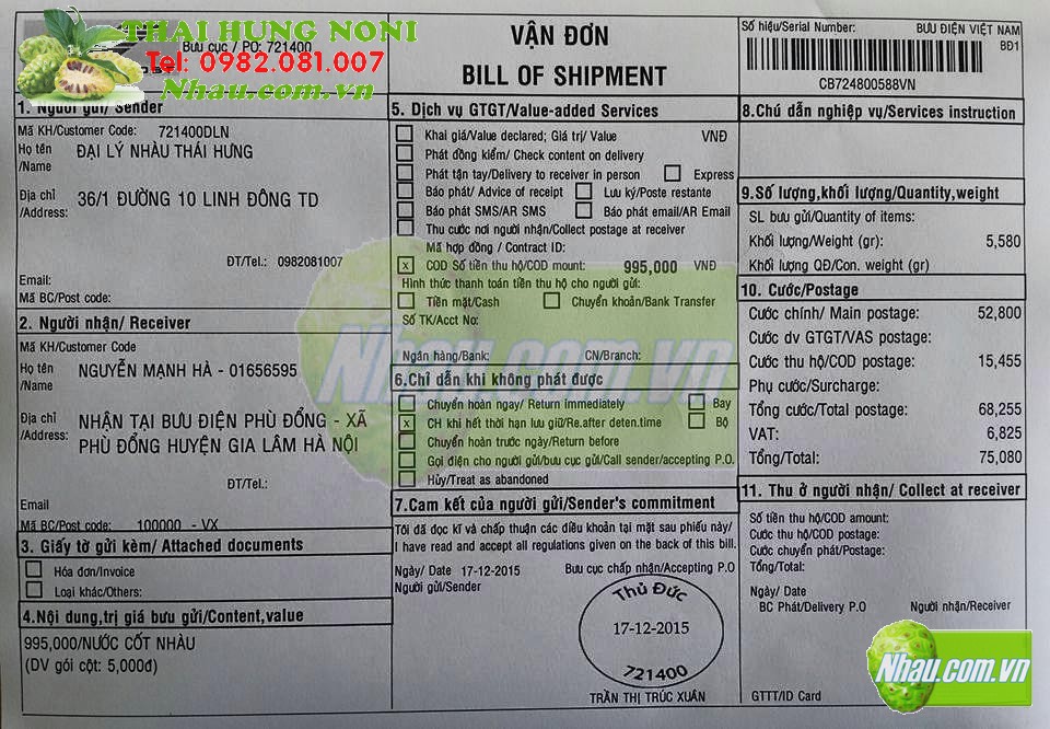 Ngày 17/12/2015: Khách hàng: NGUYỄN MẠNH HÀ
