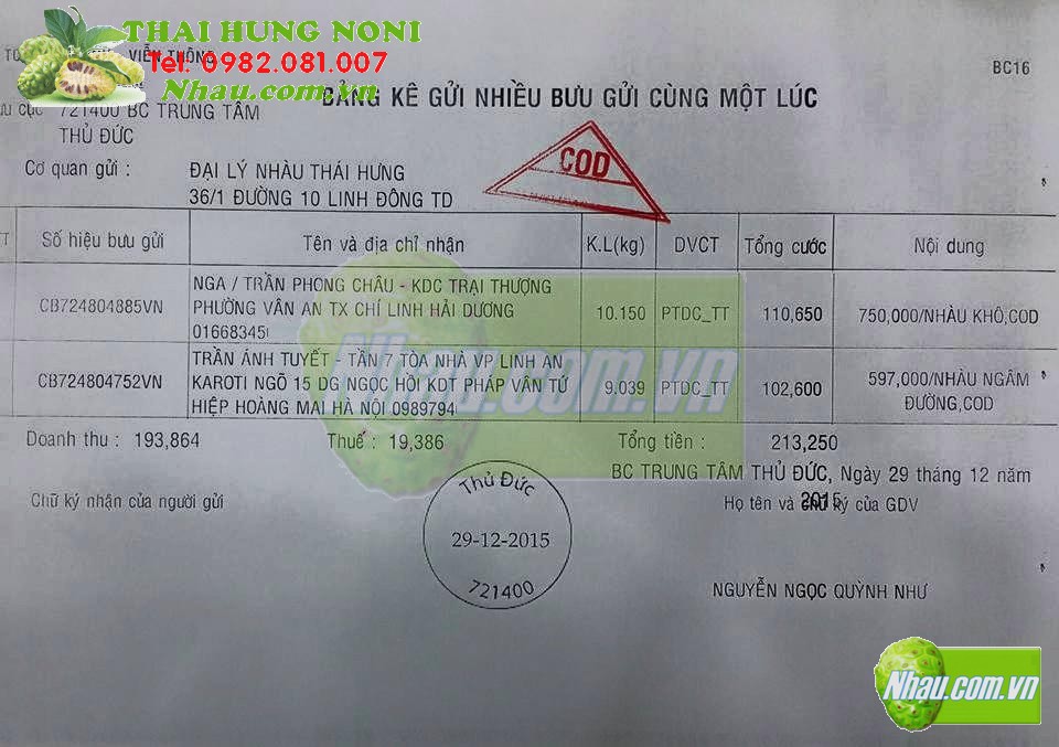 Ngày 19/12/2015: Khách hàng: VƯƠNG KHẮC THÀNH