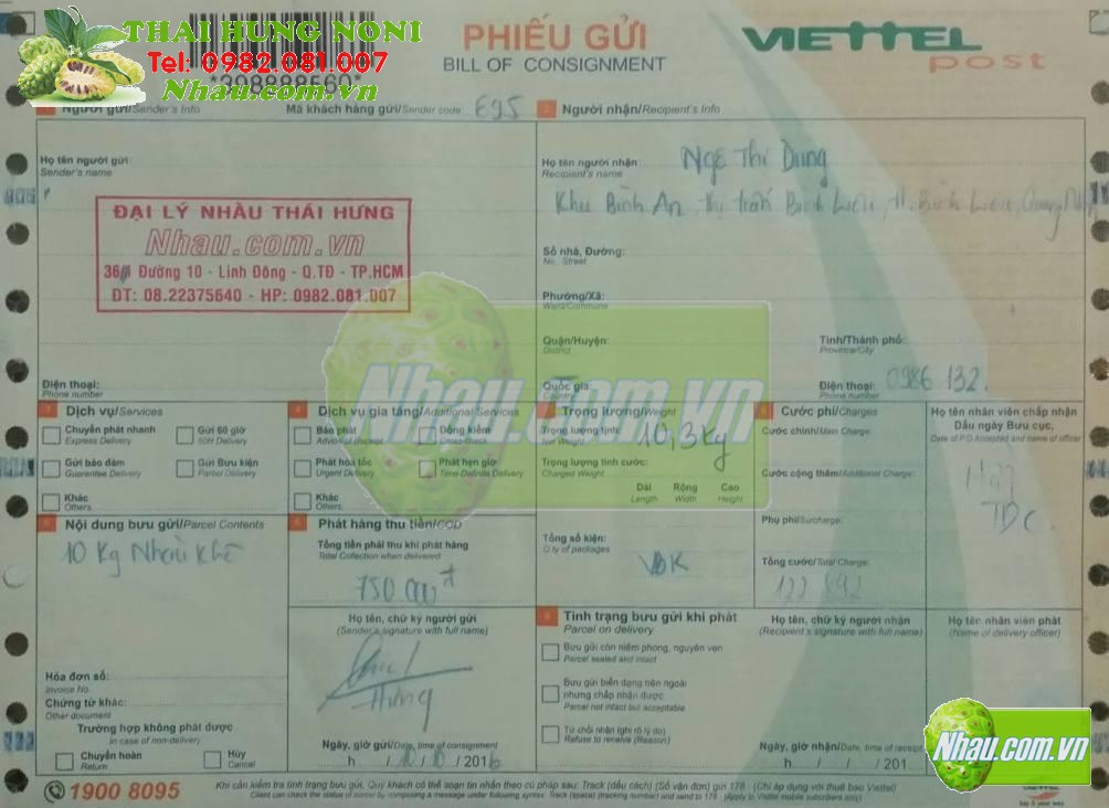 Ngày 10/10/2016: Khách hàng: NGÔ THỊ DUNG